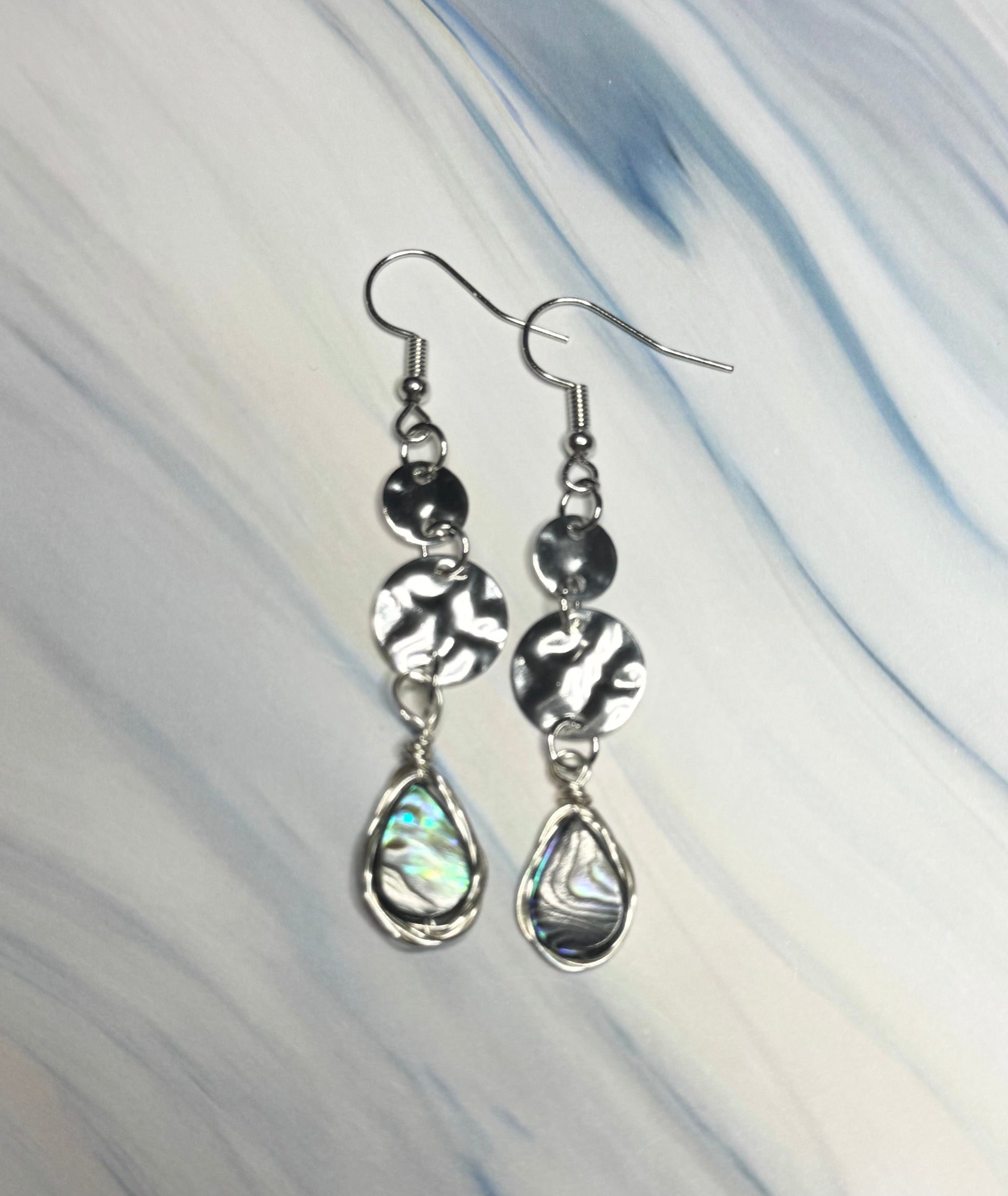 These lightweight earrings pair wire-wrapped abalone charms with hammered silver discs in mixed sizes. Subtle with just enough movement to catch the light.