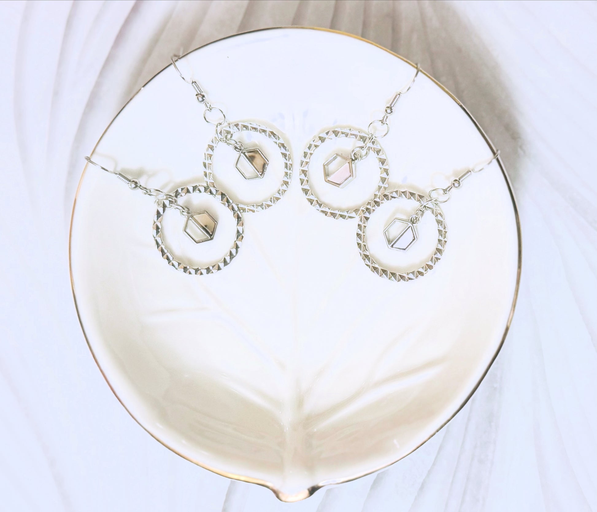 These lightweight hammered hoops feature a faceted texture and geometric open charms for a clean, modern edge.